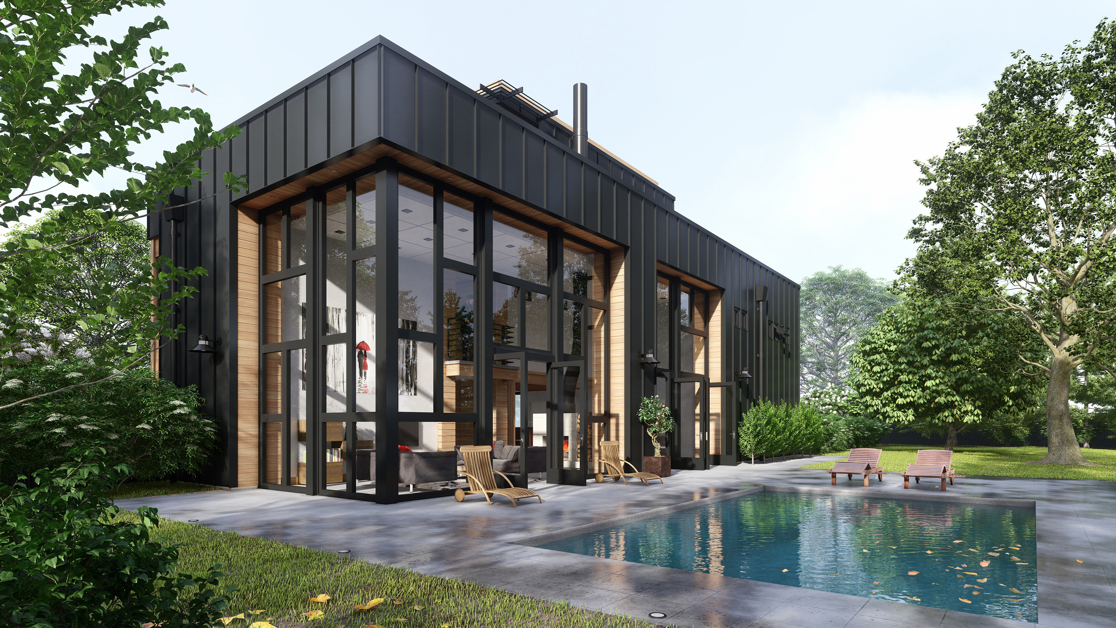 3D Visualization: Red Industrial House rainy afternoon